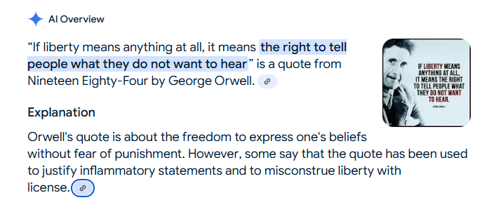 Editor’s note: Apart from anything else, AI keeps getting even simple things wrong. Twice this week the Google ‘AI Overview’ that now appears at the top of searches has given false information. In looking up a George Orwell quote, the AI Overview wrongly asserted that it came from 1984, when in fact it comes from a preface to Animal Farm.