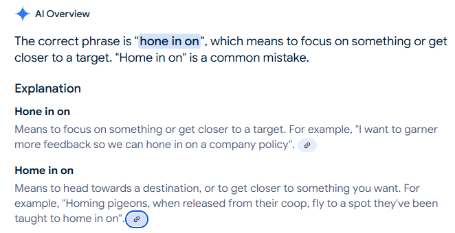 The AI Overview also claimed, in a different search, that the correct phrase is “hone in on”, while “home in on” is a “common mistake”. In fact, as the top search result below the AI Overview, an article from Merriam-Webster, relays, the original phrase is “home in on”, derived from homing pigeons, and “hone in on” is a more recent corruption.