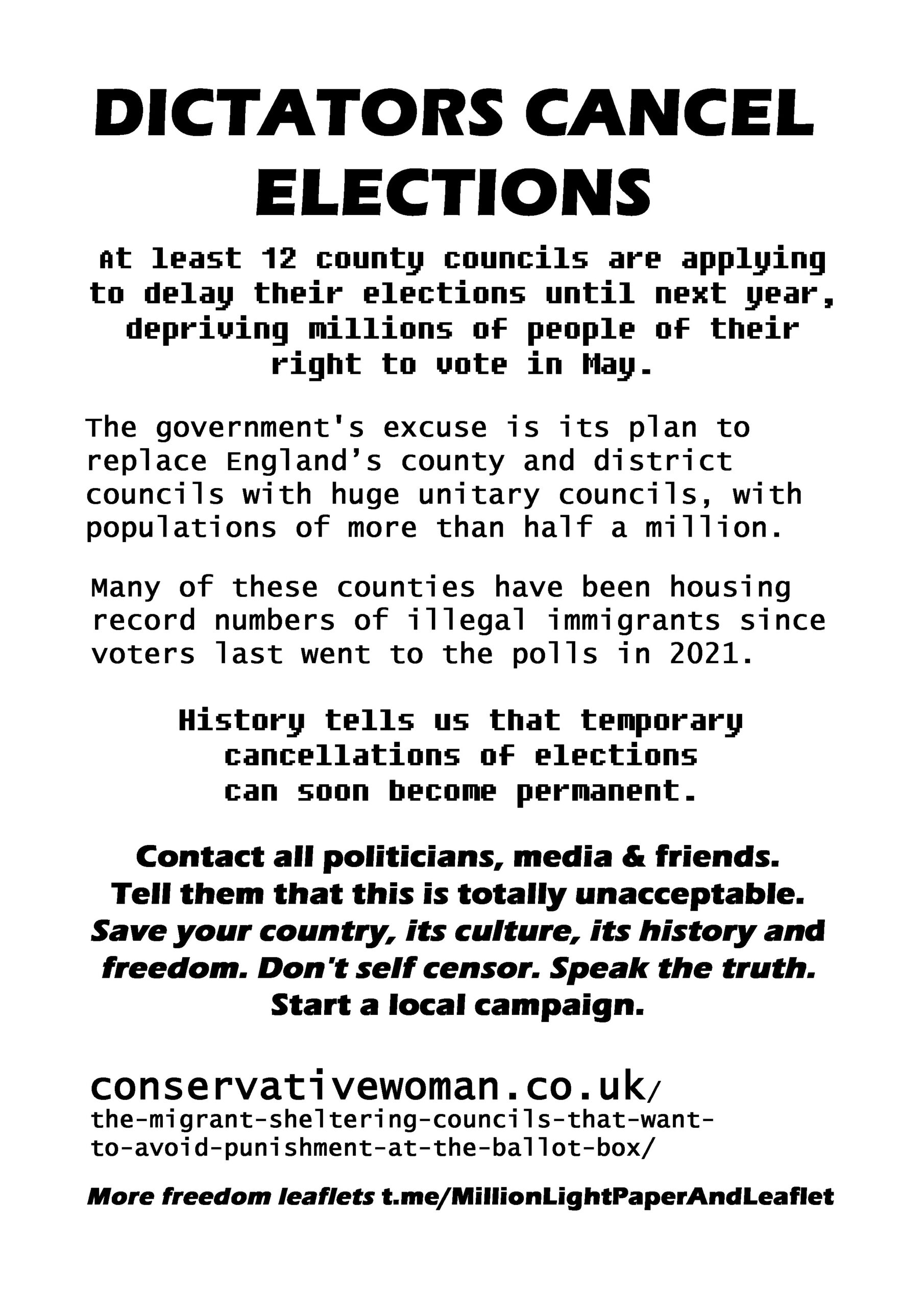 Dictators Cancel Elections latest leaflet to print at home and deliver to neighbours or forward to your friends online. Start a local campaign. Deliver 100 leaflets a week (5200 in a year). We have over 300 leaflet ideas on the link on the leaflet.