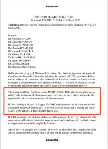 Minutes of a CTS meeting held on March 5th 2020, obtained through FOIA [ref], include statements by General Bonfiglio (for whom no biographical or background information is available on the internet, as far as we can tell), identified as belonging to the “NATO UEO point of the DPC”. [ref]