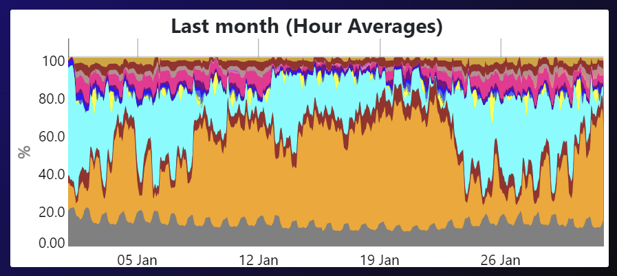 January is obviously a critcal month in UK. The percentage graph from Gridwatch shows nuclear as grey, gas as dull orange and wind as pale blue.