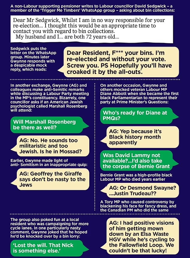 After the councillor shared the letter among fellow Labour figures in the WhatsApp group, Mr Gwynne wrote a suggested response: “Dear resident, F*** your bins. I’m re-elected and without your vote. Screw you. PS: Hopefully you’ll have croaked it by the all-outs.” ‘All-outs’ are elections at which every council seat is contested at once.