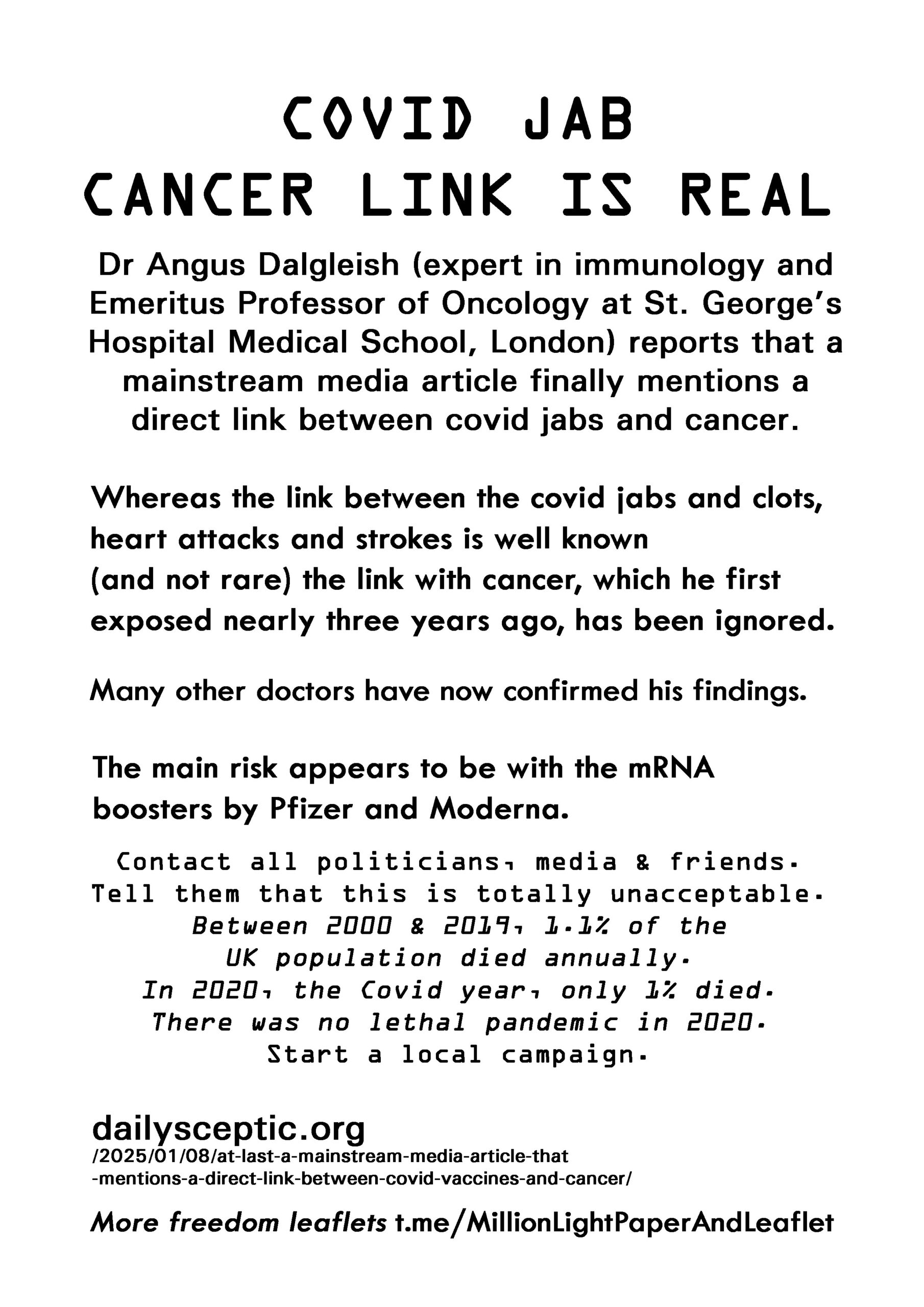 Covid Jab Cancer Link Is Real latest leaflet to print at home, deliver to neighbours, forward to your bad MP & friends online. Start a local campaign. Deliver 100 leaflets a week (5200 a year). Over 300 leaflet ideas on the link on the leaflet.