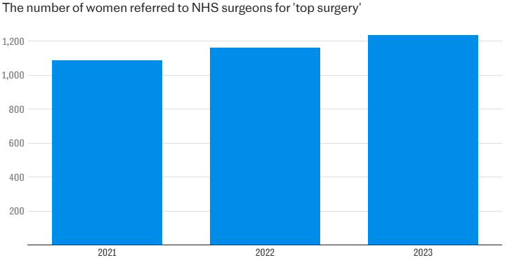 Over three years, it also sent more than 780 women for “masculinising genital gender reassignment surgery”, also known as “bottom surgery”.
