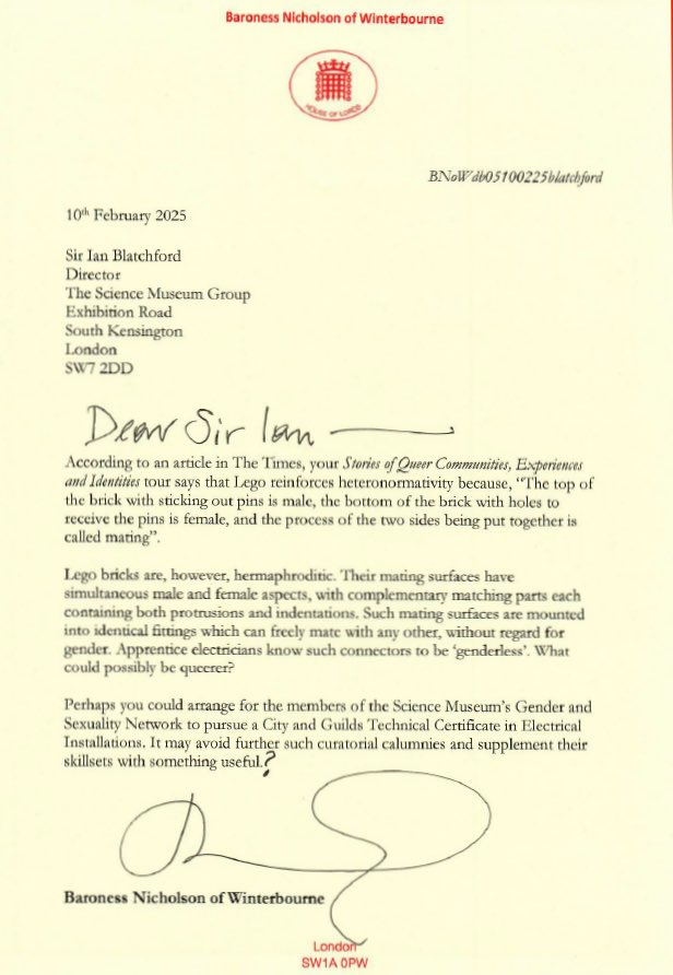 Any electrician knows that Lego bricks are genderless, not ‘heteronormative’, because each can ‘mate’ with any other. But it seems members of the Science Museum’s Gender and Sexuality Network are ignorant of this. Perhaps they should study for an electrical qualification, suggests Baroness Nicholson of Winterbourne in a letter to the museum’s Director, posted on X. “It may avoid further such curatorial calumnies and supplement their skillset with something useful.”