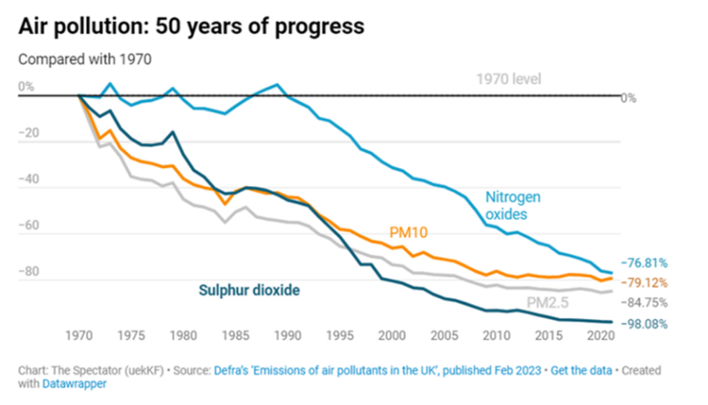 As the graph in the article makes clear, as heavy industries have declined and vehicle engines have become cleaner, the air in Britain’s cities is of the order of 90% less polluted than in the 1950s: