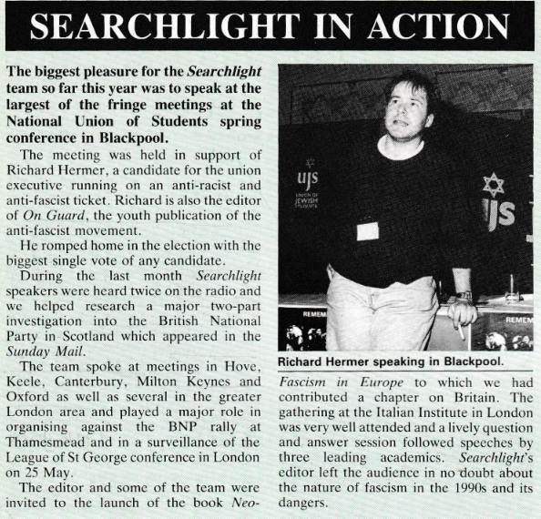 This youthful far-Left politics is apparently not something Hermer wants widely known. In a recent interview with the House magazine, he details his career in student politics as chair of the students’ union and a National Executive member of the National Union of Students, but omits entirely his association with Searchlight. In reality, as the below Searchlight clipping shows, he might never have achieved the NUS role were it not for his being a Searchlight member and its campaign on his behalf.
