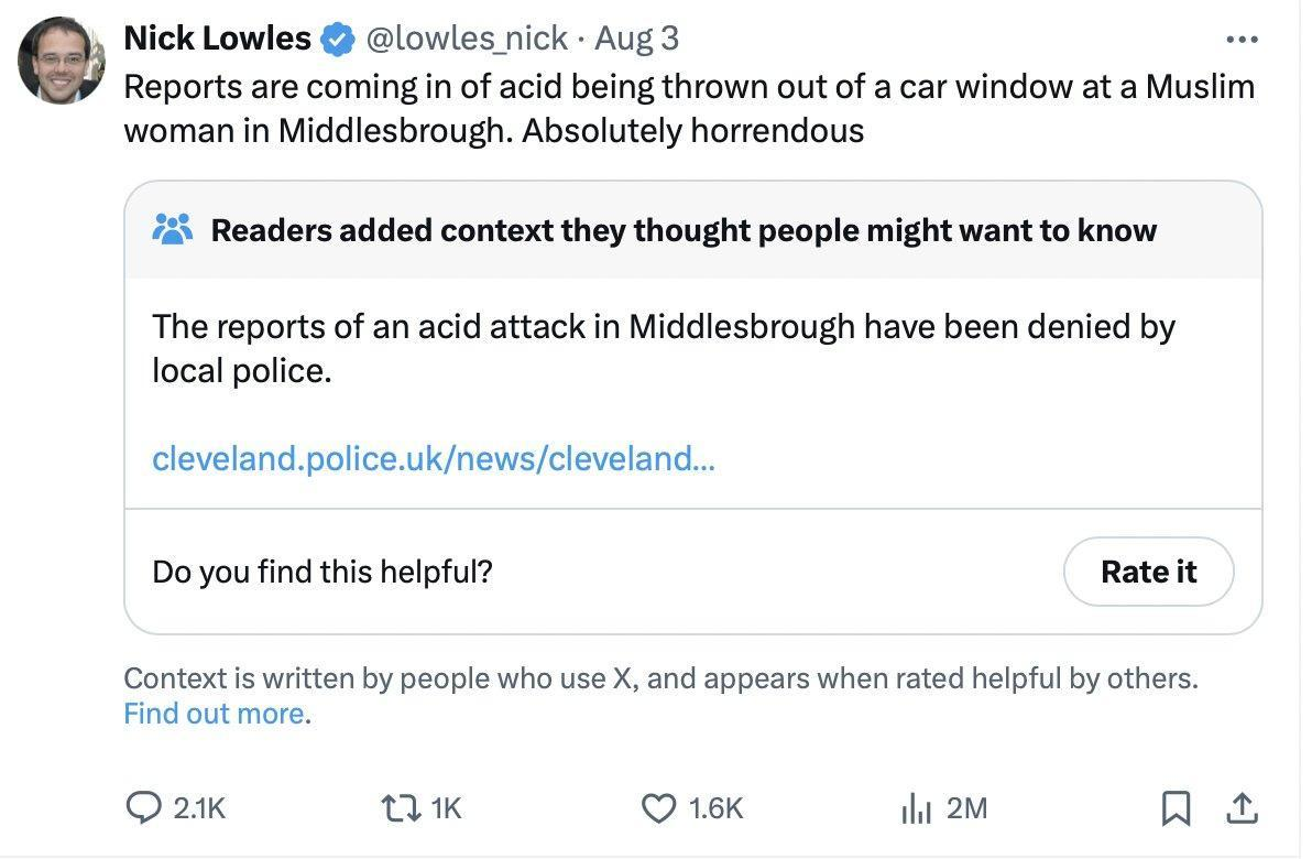 One of the ongoing questions about Lowles is why he was never similarly charged for his tweet during the disorder spreading misinformation about an alleged acid attack against a Muslim woman – a story which was swiftly being repeated by Muslim groups on the streets, some of which would go on to visit sectarian violence on random white passersby.