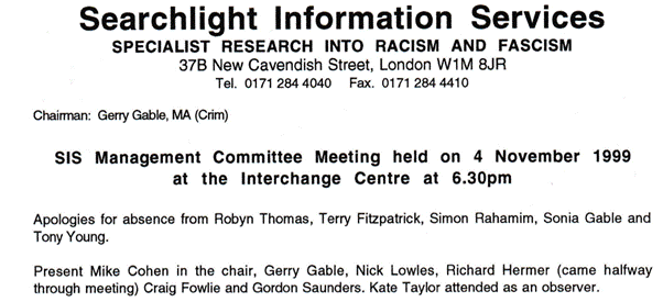 Later, minutes show Lord Hermer missing a meeting in June 1999 and attending one in November that year – alongside a certain Nick Lowles, who was Co-Editor and then Editor of Searchlight between 1999-2011 and in 2004 founded Hope Not Hate.