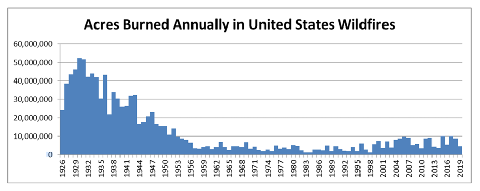 The graph clearly shows that there is an upward trend in wildfire acreages since the turn of the century, however it would be instructive to learn what these figures represent in percentages of the forest areas concerned.