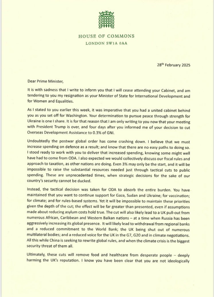 Anneliese Dodds has quit as International Development Minister over Keir Starmer’s decision slash the aid budget by 40% to pay for higher defence spending, saying it looks like following in Trump’s footsteps. The Telegraph has more.