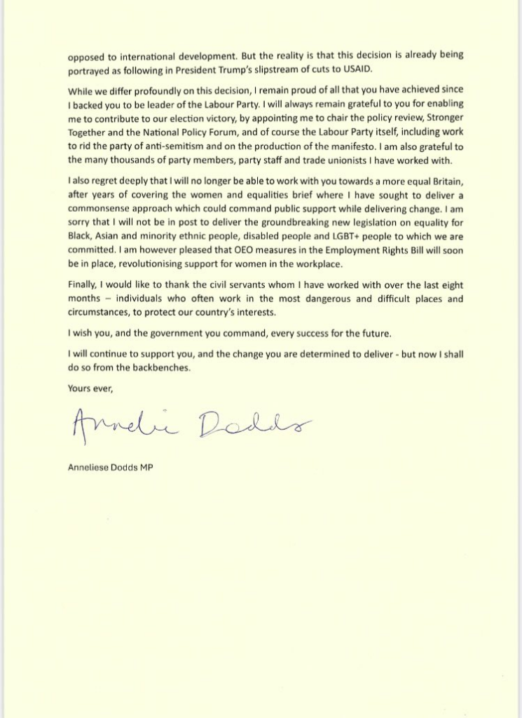 Anneliese Dodds Resigns Over Starmer’s Decision to Slash Aid Budget Saying it Looks Like Following in Trump’s Footsteps