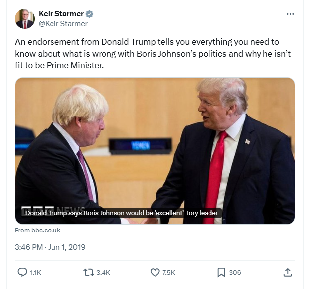 In 2019 Starmer tweeted: “An endorsement from Donald Trump tells you everything you need to know about what is wrong with Boris Johnson’s politics and why he isn’t fit to be Prime Minister.”