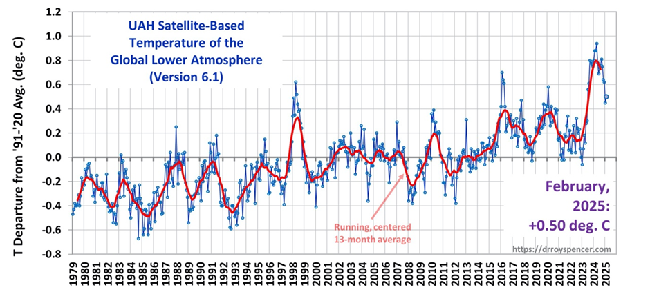 “The latest UAH global temperature reading shows a +0.5°C anomaly for February 2025. “
