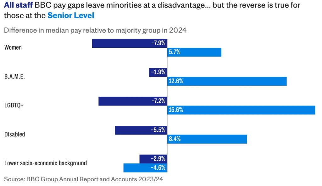 Figures in the BBC’s 2023/24 annual report show that senior managers who are lesbian, gay, bisexual and transgender (LGBT) earn salaries 15.6% larger than those who are not.