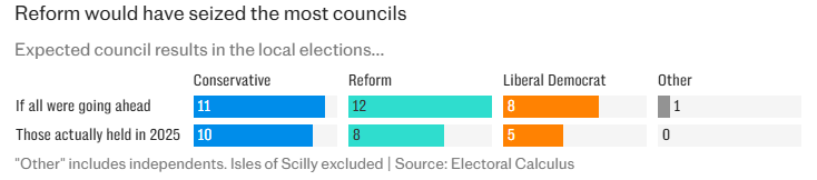 However, had elections in a further nine areas not been delayed, Reform would have won 12 councils to the Tories’ 11. The poll findings are likely to spark demands for all the votes to go ahead without delays.