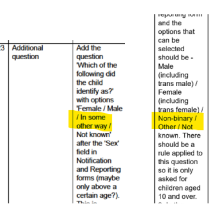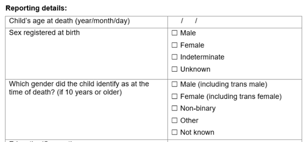 The forms for reporting a child’s death have been recently updated to include a question about a child’s gender identity. Please see here.