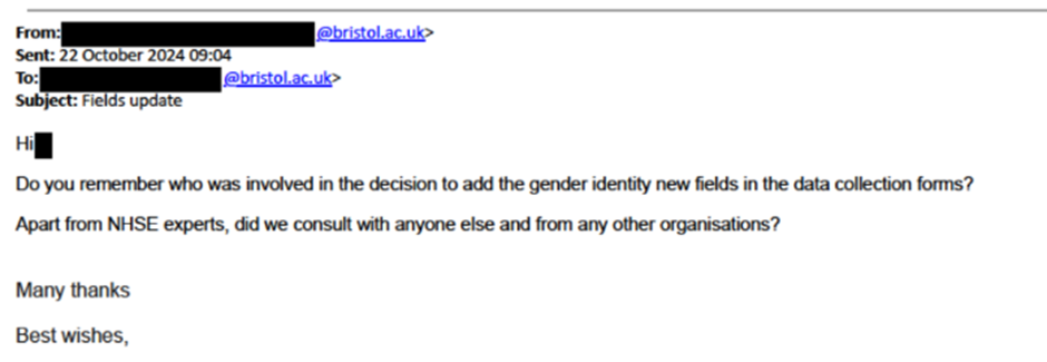 That was it. Follow-on policy papers, rationale, justifying logic? No. “FOI Q1. The University does not hold any policy or positioning papers falling within the scope of your request.” “FOI Q3. The University does not hold any further information beyond the attached [emails] falling within the scope of your request.”