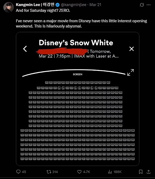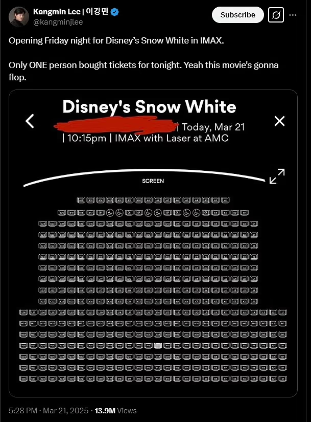 They posted on X: “Opening Friday night for Disney’s Snow White in IMAX. Only ONE person bought tickets for tonight. Yeah this movie’s gonna flop.”