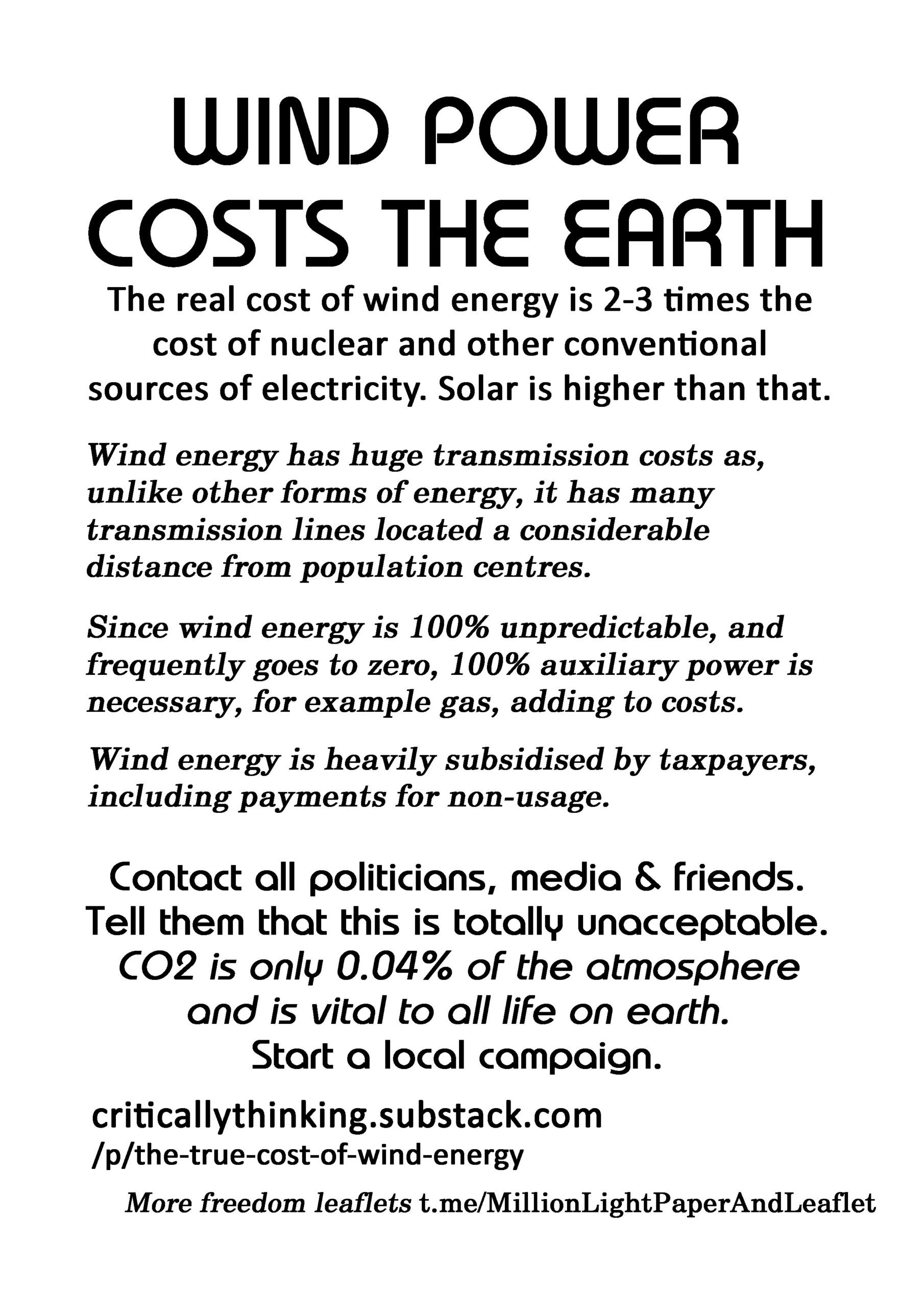 Wind Power Costs the Earth – latest leaflet to print at home, deliver to neighbours, forward to your bad MP & friends online. Start a local campaign. Deliver 100 leaflets a week (5200 a year). Over 300 leaflet ideas on the link on the leaflet.