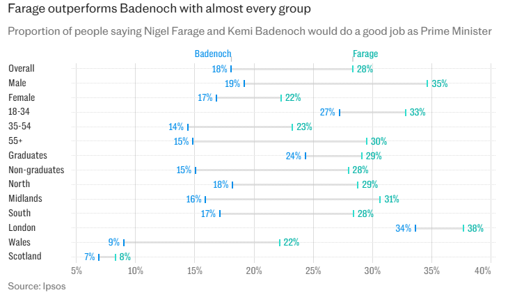 “Ipsos reveals that when asked who would do a “good job as Prime Minister”, Farage comes out on top on 28%. Keir Starmer is 1% behind,”
