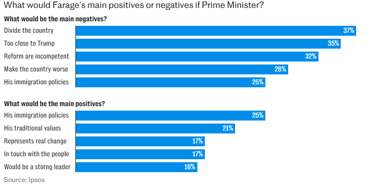 “Farage is weaker on being a “divisive figure”, his closeness to Donald Trump and whether the party has the intellectual depth to actually form a government.”