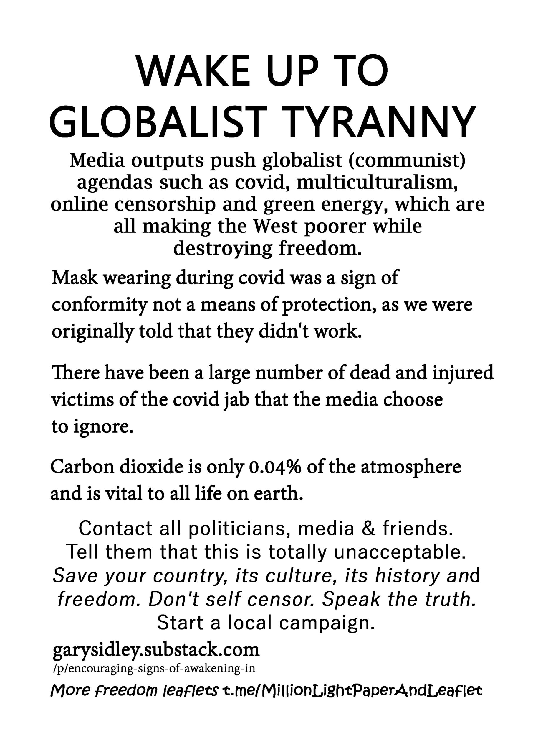 Wake up to Globalist Tyranny – latest leaflet to print at home, deliver to neighbours, forward to your bad MP & friends online. Start a local campaign. Deliver 100 leaflets a week (5200 a year). Over 300 leaflet ideas on the link on the leaflet.