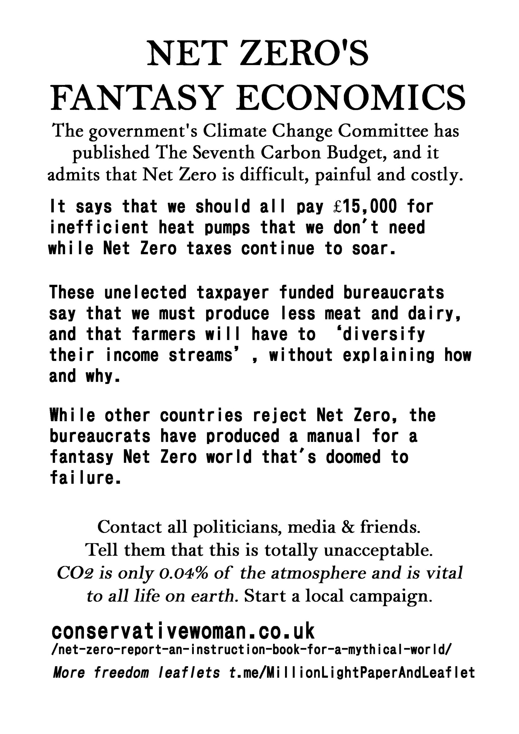 Net Zero’s Fantasy Economics – latest leaflet to print at home, deliver to neighbours, forward to your bad MP & friends online. Start a local campaign. Deliver 100 leaflets a week (5200 a year). Over 300 leaflet ideas on the link on the leaflet.