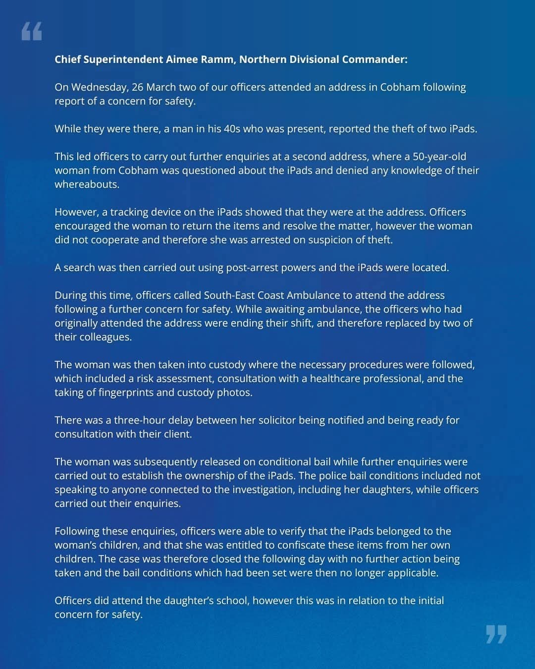 They say there’s no further action, but surely (as they admit she was entitled to take them) there was never an offence in the first place and therefore the arrest and detention should never have happened?