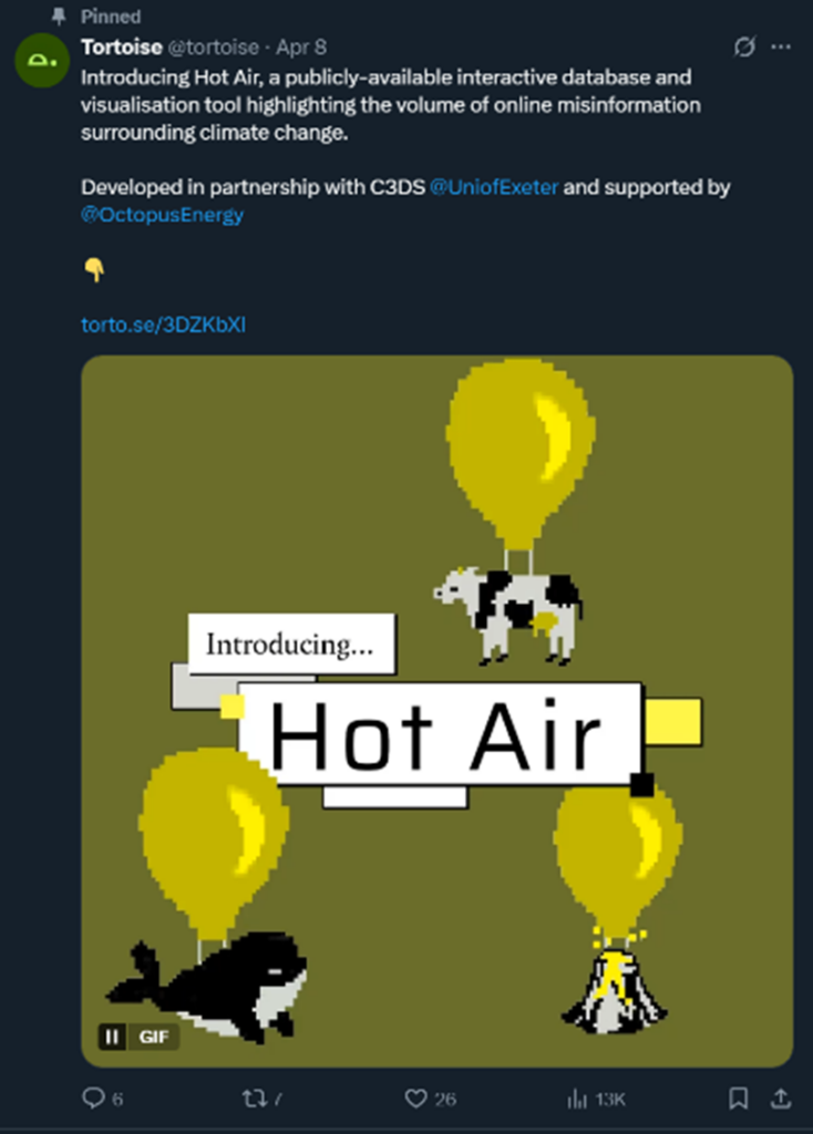 Tortoise boast that Hot Air has been developed with an outfit called “C3DS” based at the University of Exeter – which is also home to the ‘Greenpeace Research Laboratories’, or ‘science unit’, the origin of much fake news. The Centre for Climate Communication and Data Science, or C3DS, claims to “improve strategic communications to deliver meaningful action on climate change”, which it supports with “AI and social science research”.