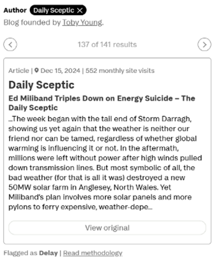 Stop Press 2: David Turver tweets that the list actually serves as a handy guide to who’s who in the sceptical world. “A new ‘misinformation’ database produced by Tortoise Media, C3DS and sponsored by Octopus Energy turns into showcase for Net Zero scepticism. Helpfully, you can filter the database by author. Yours truly is the highest ranked UK individual, with US creators like Tom Nelson, Steve Milloy and Alex Epstein topping the list.”