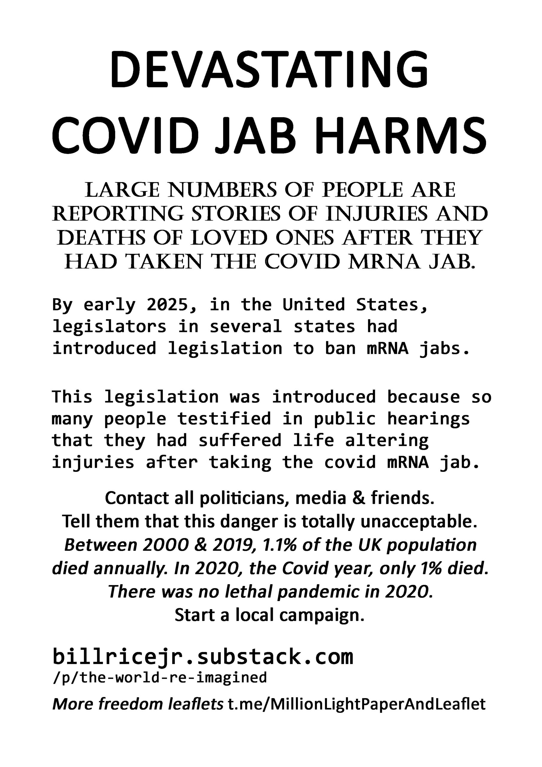 Devastating Covid Jab Harms – latest leaflet to print at home, deliver to neighbours, forward to your bad MP & friends online. Start a local campaign. Deliver 100 leaflets a week (5200 a year). Over 300 leaflet ideas on the link on the leaflet.