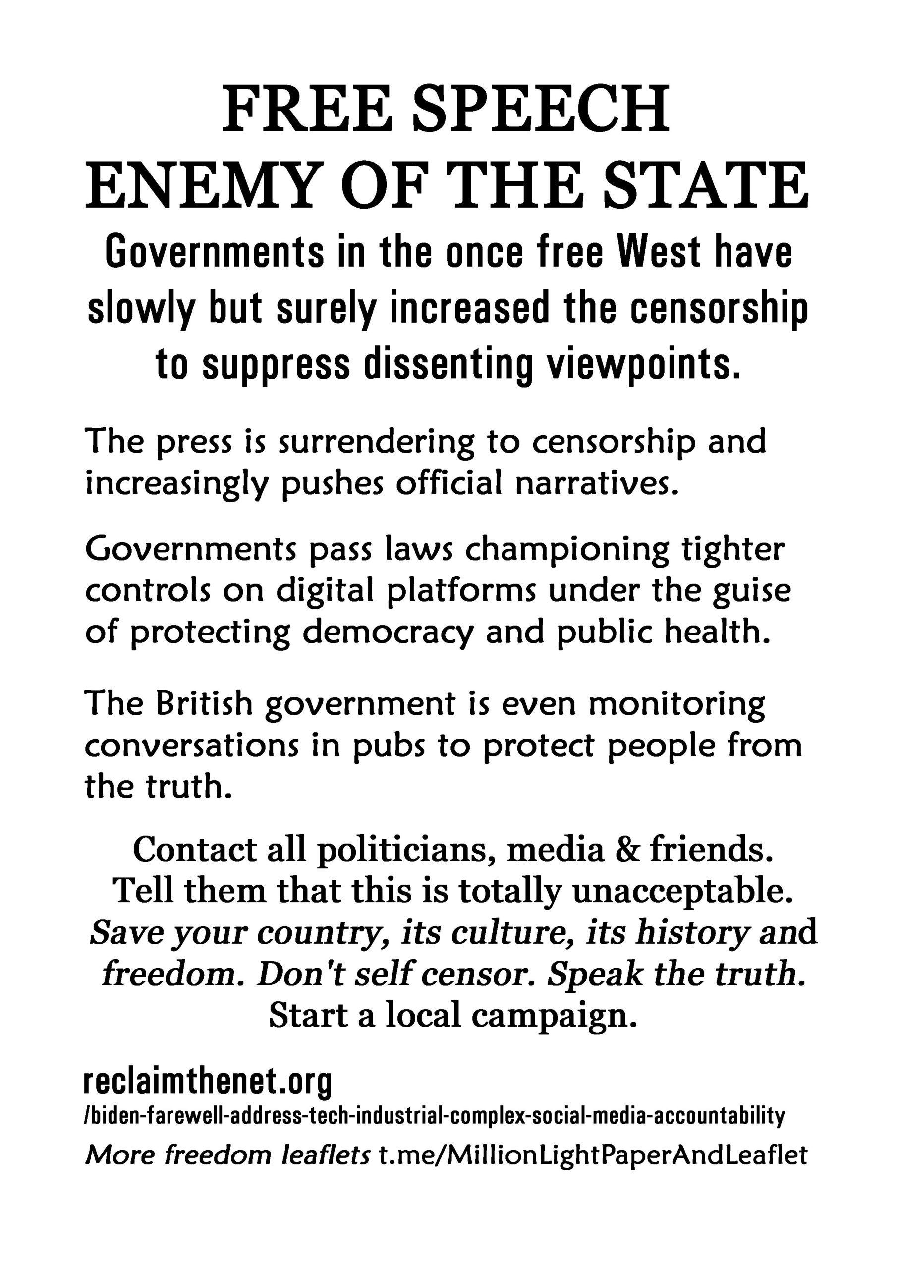 Free Speech Enemy Of The State – latest leaflet to print at home, deliver to neighbours, forward to your bad MP & friends online. Start a local campaign. Deliver 100 leaflets a week (5200 a year). Over 300 leaflet ideas on the link on the leaflet