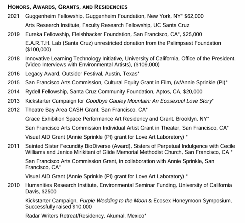 To put it mildly, none of the above enterprises seem likely to enjoy much commercial viability. So how have Stephens and Sprinkle managed to fund their full-time quest of roaming the globe doing things like “demonstrating grassilingus” upon a university lawn? Simple. Being involved in both academia and the arts, they are experts in applying for and receiving large grants, probably simply by writing shibboleth buzz-words like ‘climate-change’, ‘queerness’ and ‘intersectionality’ on their application papers: