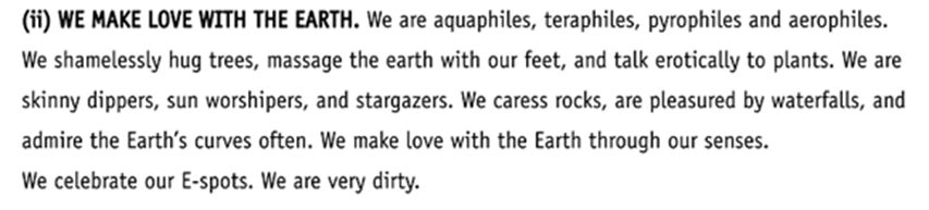 Possibly this all began as a mere niche sexual activity, but in recent years it has more definitely morphed into a form of green activism, or a “pleasure-centric framework for climate justice” and a “distinctly queer strand of climate activism”, as it has been described. Distinctly ethically minded, today’s green ecosexuals engage in earnest ethical debates about whether it is necessary to gain psychic consent from a tree before one hugs it (or worse).