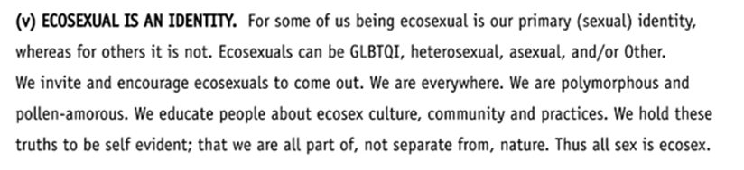 What are the roots of this reborn pagan madness? They lie in the all-consuming queer mid-2000s campaign to legalise gay marriage across the West. Two committed campaigners for this cause at the time were a pair of lesbian lovers named Beth Stephens and Annie Sprinkle, now artists and academics, and the twin authoresses of The Ecosex Manifesto, a document which contains several clauses that would have made Marx and Engels blush redder than their favourite flag: