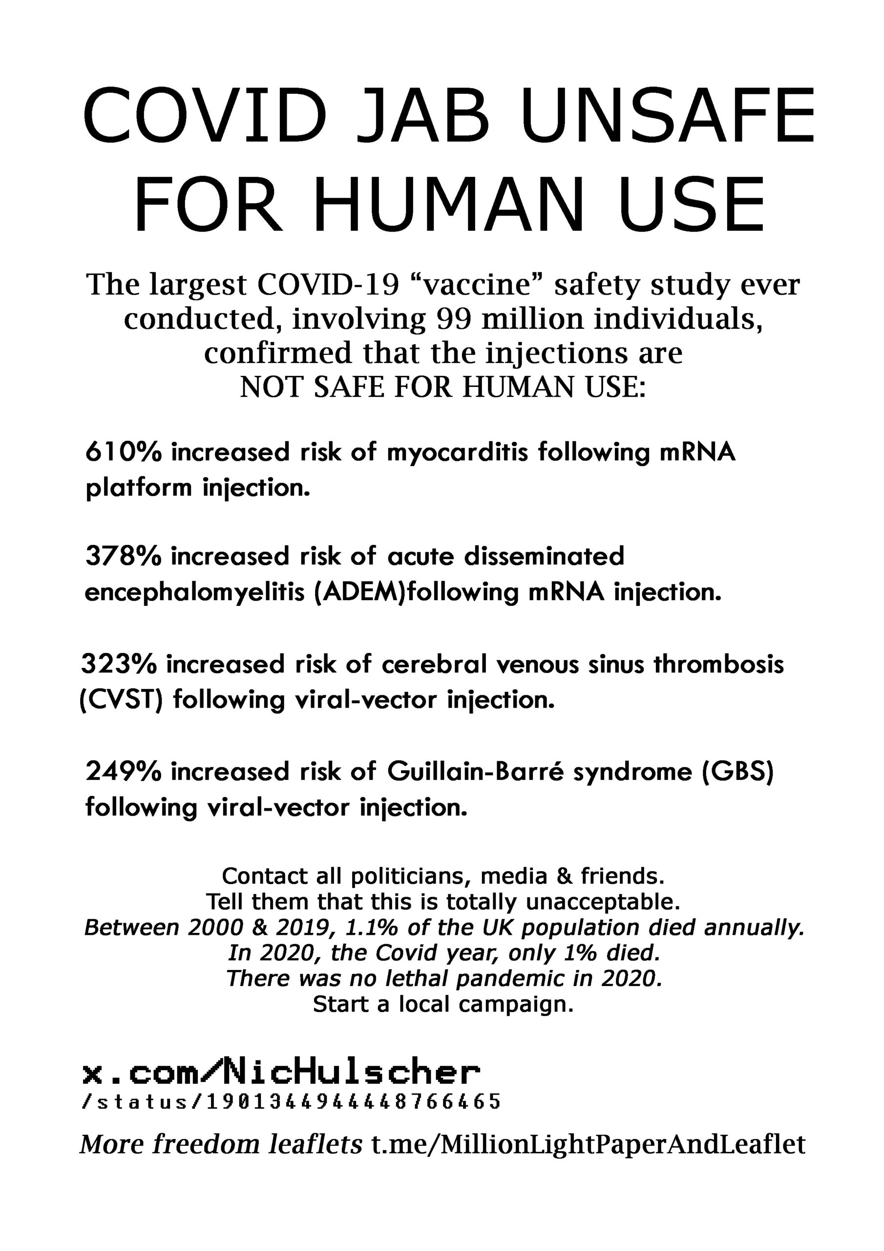 Covid Jab Unsafe For Human Use – latest leaflet to print at home, deliver to neighbours, forward to your bad MP & friends online. Start a local campaign. Deliver 100 leaflets a week (5200 a year). Over 300 leaflet ideas on the link on the leaflet.