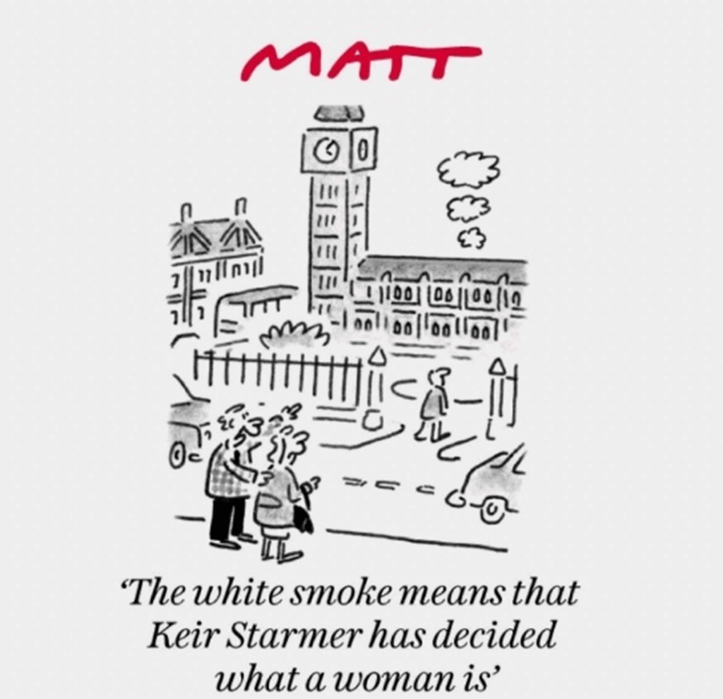 The Telegraph cartoonist Matt was as usual on sharp form, depicting Westminster as the papal conclave with white smoke showing that the Starmer “has decided what a woman is”.