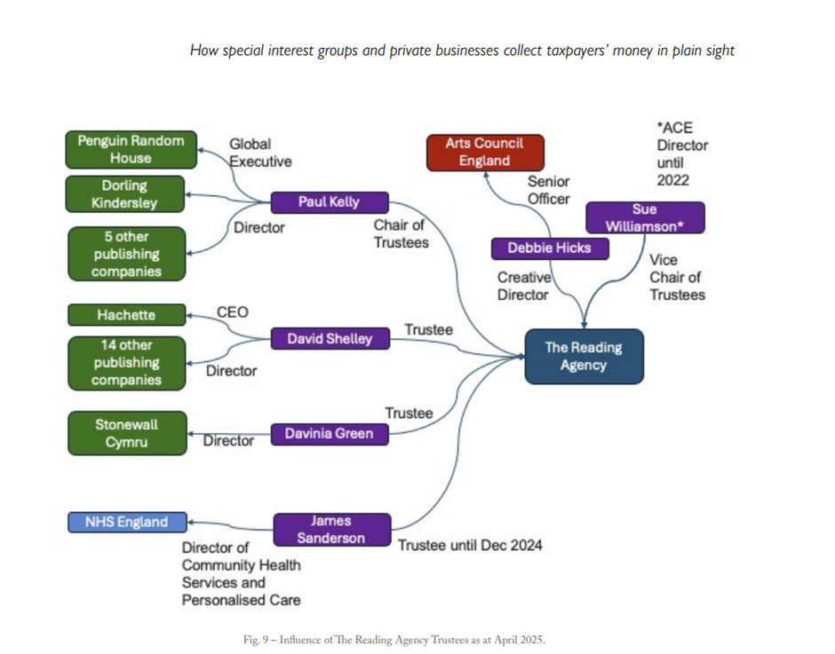 Between them, David Shelley and Paul Kelly hold directorships at 23 publishing houses and both are Trustee Directors of the Reading Agency. David Shelley is a Director at Hodder & Stoughton Ltd, and CEO at Hachette. Hachette owns or trades under the name of Franklin Watts, Jessica Kingsley Publishers and Wayland. Meanwhile, the portfolio of publishing houses under David Shelley’s influence owns a high proportion of the titles on the Reading Well book lists. Whilst there is no evidence of any wrongdoing, of the 33 books in the current Reading Well for Children list, 16 are from Hachette or Hodder, including eight titles from Jessica Kingsley Publishers.