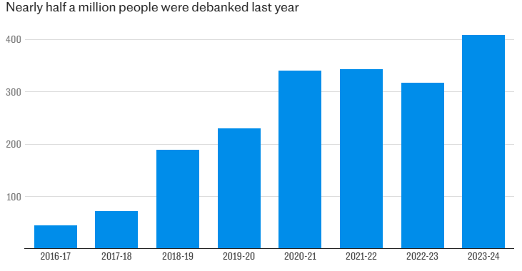It comes after figures from the Financial Conduct Authority (FCA) – obtained by the Telegraph – revealed half a million customers were debanked last year, the highest number in over a decade.