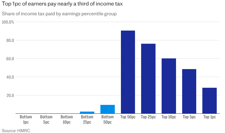There is a lot at stake: the top 1% of the highest-earning workers pay 28.2% of all of the Government’s income tax revenues. If you zoom out a little further, the top 5pc pay just less than half at 48.8%.