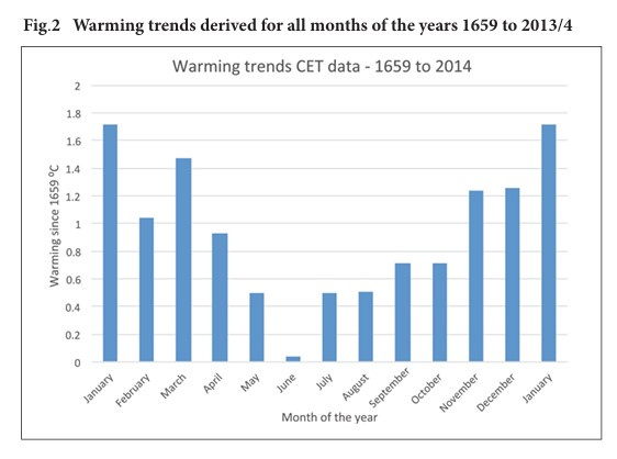 Fig 2: Warming trends CET data – 1659 – 2014