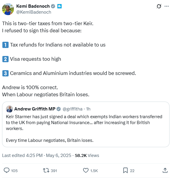 Conservative leader Kemi Badenoch has branded the deal “two-tier taxes from two-tier Keir”. She tweeted: