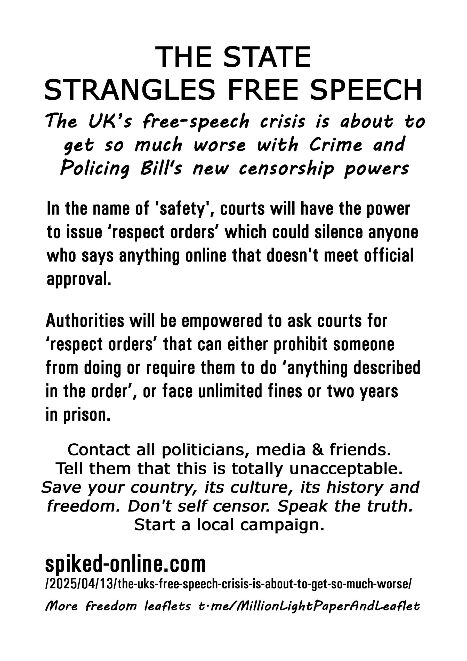 The State Strangles Free Speech – latest leaflet to print at home, deliver to neighbours, forward to your bad MP & friends online. Start a local campaign. Deliver 100 leaflets a week (5200 a year). Over 300 leaflet ideas on the link on the leaflet.