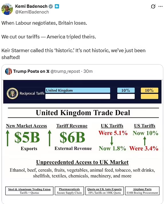 Conservative leader Kemi Badenoch slammed the deal, tweeting that since America tripled its tariffs while Britain slashed ours, we have been “shafted”.