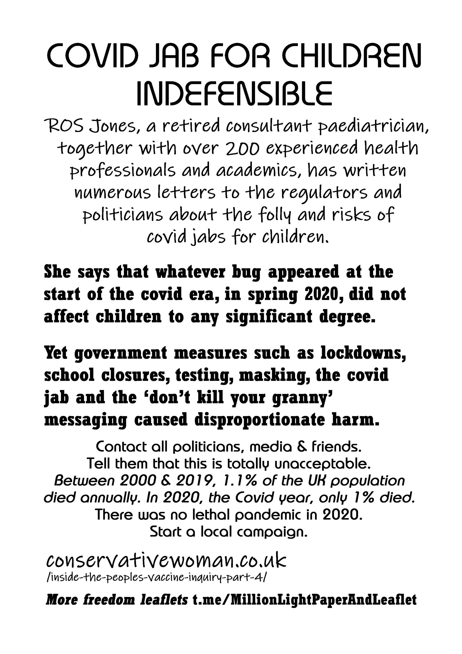 Covid Jab for Children Indefensible – latest leaflet to print at home, deliver to neighbours, forward to your bad MP & friends online. Start a local campaign. Deliver 100 leaflets a week (5200 a year). Over 300 leaflet ideas on the link on the leaflet.