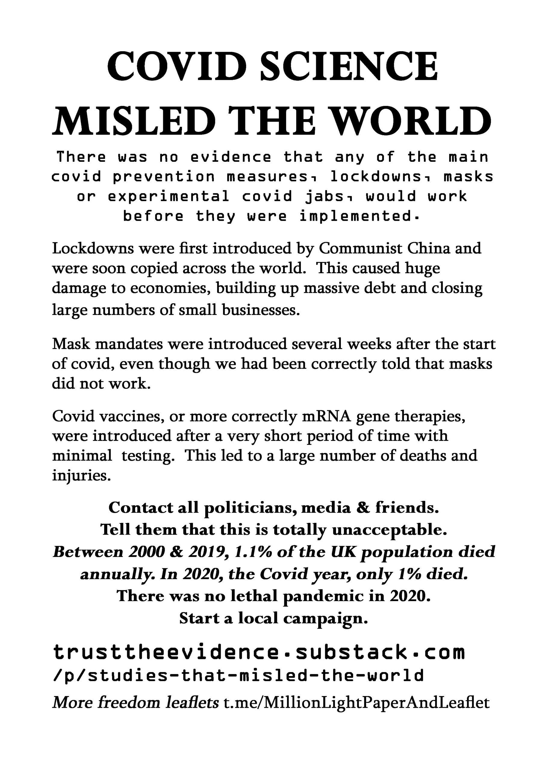 Covid Science Misled The World – latest leaflet to print at home, deliver to neighbours, forward to your bad MP & friends online. Start a local campaign. Deliver 100 leaflets a week (5200 a year). Over 300 leaflet ideas on the link on the leaflet.