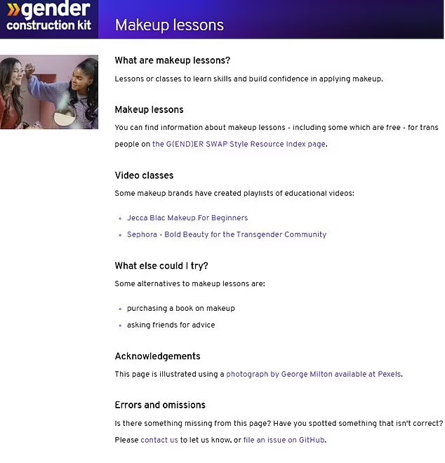 It also offers tips on using nail varnish, eyelash extensions, perfume and the correct underwear to transition to their desired gender.