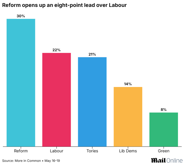 A poll today [from More in Common] showed Reform eight points ahead of Labour in the wake of its local elections surge.