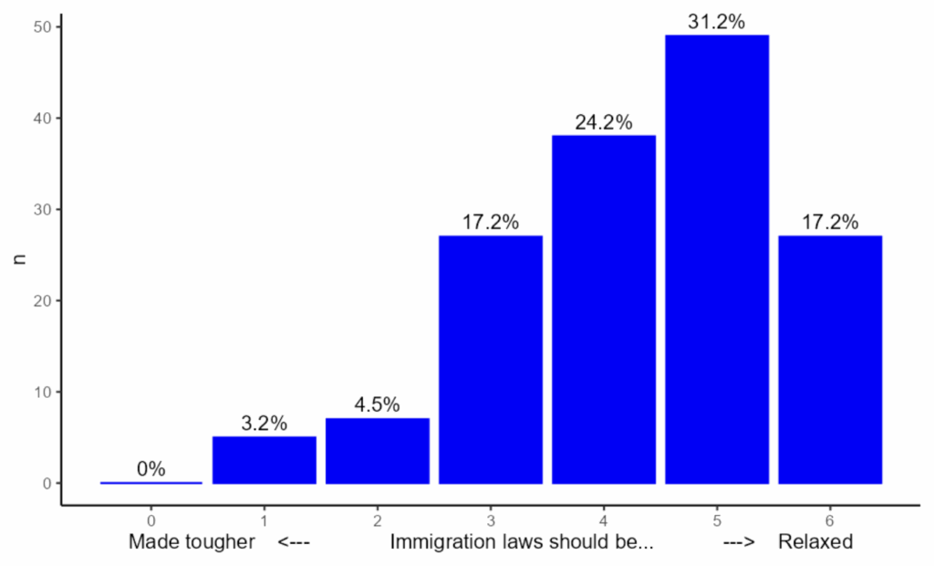 ‘So what?’ you might say. ‘Some researchers lean one way. Some lean the other way. And it all cancels out, right?’ Well, not quite. As the chart above shows, there were substantially more pro-immigration researchers than anti-immigration researchers. The ‘net ideology’ of those who took part was not neutral but moderately pro-immigration. And this reflects the pattern in academia more broadly.